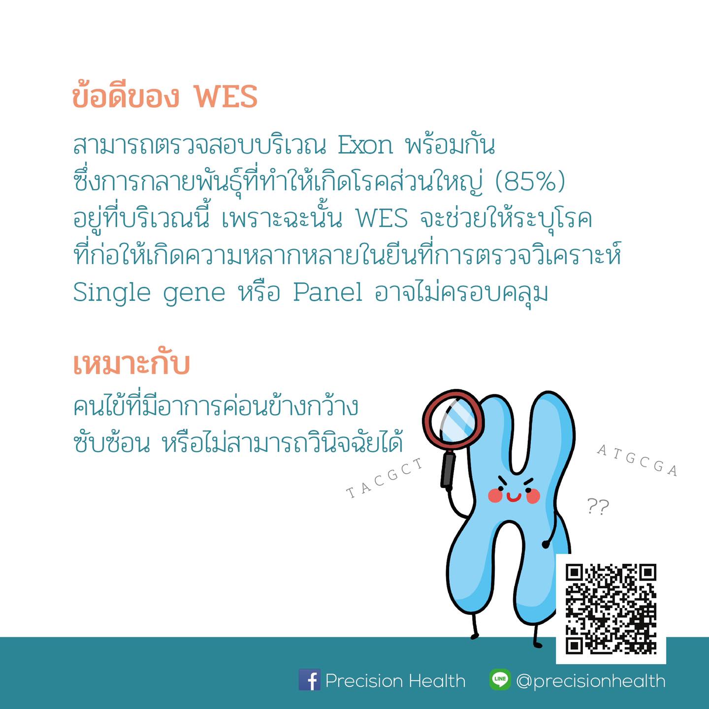 เพราะฉะนั้นการตรวจวิเคราะห์ด้วย WES นี้ จะสามารถช่วยคุณหมอวินิจฉัยโรคของคนไข้ได้อย่างถูกต้องและแม่นยำมากยิ่งขึ้น อันนำไปสู่การวางแนวทางการรักษาที่ดีขึ้นเช่นเดียวกันครับ